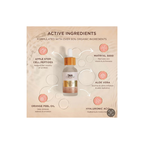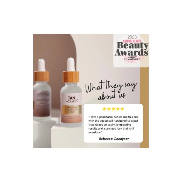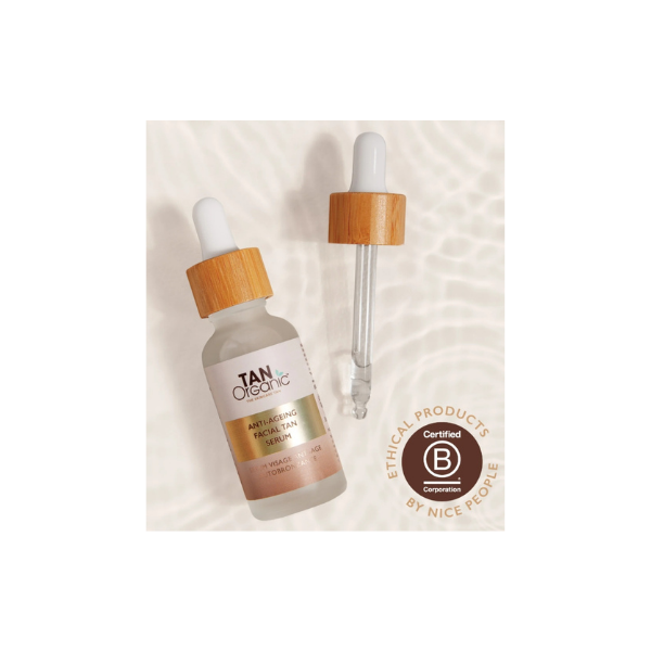 Glow slimmer met de TanOrganic Anti-Ageing Facial Tan Serum, een lichtgewicht, snel absorberend zelfbruinend serum dat hydrateert, voedt en zorgt voor een natuurlijke, stralende teint. Gemaakt met gecertificeerde biologische ingrediënten en speciaal ontwikkeld voor de gevoelige huid van het gezicht. Het serum bouwt geleidelijk een zongekuste glow op die tot wel 7 dagen aanhoudt.